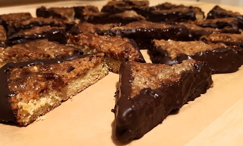 Bei 175° C Ober-/Unterhitze im vorgeheizten Backofen ca. 25 Minuten backen. Noch warm zunächst in Rechtecke, dann in Dreiecke schneiden und die Ecken in Kuvertüre bzw. Schokoladenglasur tauchen.