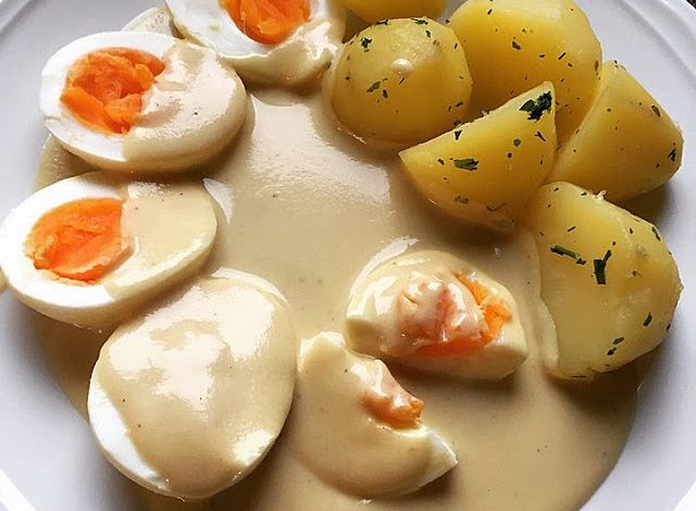 Währenddessen eine Mehlschwitze aus Butter und Mehl herstellen. Die Milch nach und nach dazugeben und dabei weiter kräftig rühren, damit nichts anbrennt. Den Topf von der Kochstelle ziehen. Den Senf und die Soße vermischen und mit Salz und Pfeffer abschmecken. Die Eier schälen, halbieren und in der Soße servieren.
