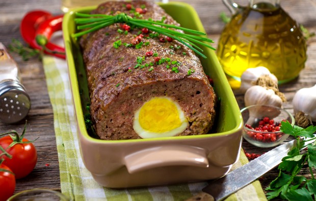 - Backrohr bei 180 °C vorheizen. Auf einem nassen Brett einen Ziegel formen und in diesen eine tiefe Kerbe eindrücken. Darin die gekochten und geschälten Eier sowie die Essiggurken einlegen und mit Faschiertem umschließen.