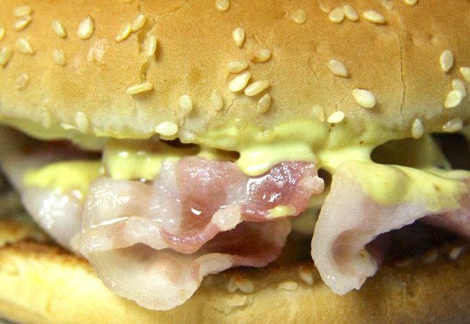 Legen Sie den Boden des Sandwichs auf das Schneidebrett, legen Sie den Hamburger mit dem geschmolzenen Cheddar darauf, legen Sie 3 Scheiben Speck, ein paar Salatstreifen, 3 dünne Tomatenscheiben und ein paar dünne Zwiebelscheiben darauf. Nehmen Sie dann die andere Hälfte des Sandwichs und verteilen Sie 2 Esslöffel Cheeseburger-Sauce auf der Innenseite. Schließen Sie das Sandwich, indem Sie es leicht andrücken. Wenn Sie möchten, legen Sie es für ein paar Sekunden wieder auf den Teller (oder in die Mikrowelle), um es aufzuwärmen: