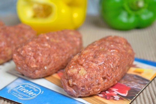 - Die Zwiebel wird geschält und in feine Würfel geschnitten. Das Faschierte wird in eine Schüssel gegeben und mit dem Zwiebel, dem Ei und dem Ajvar vermischt. Nun können Sie das Faschierte mit Salz und Pfeffer abschmecken und alles zu einer festen Masse verkneten.