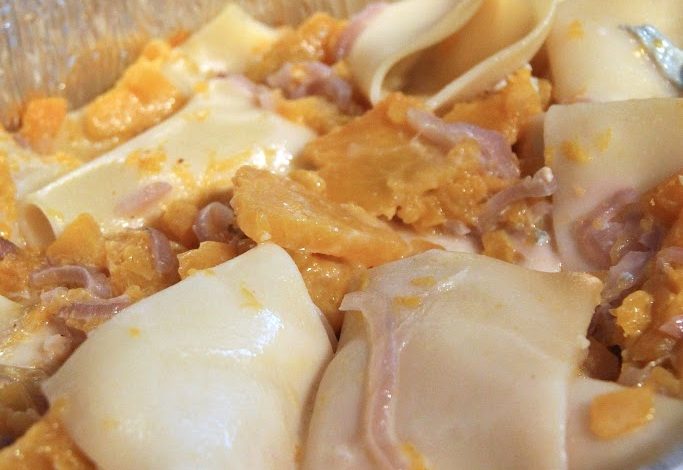 Schneiden Sie in der Zwischenzeit den Kürbis in kleine Stücke und kochen Sie diese 2-3 Minuten lang in einem Topf mit Salzwasser, in dem Sie dann auch die Nudeln kochen.