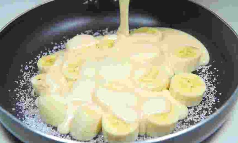 1. Als erstes die zwei Eier in einer kleinen Schüssel mit einem Mixer cremig verrühren, Mehl geben und alles gut vermischen. Dann die Banane klein schneiden und hinzugeben (oder direkt in der Pfanne geben und die Eier Masse darauf gießen).