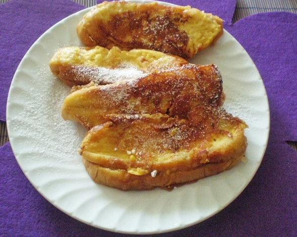 - Die zusammgesetzen Zopfscheiben in dem Eier-Milch-Gemisch wälzen und dann im Öl herausbacken bis die Pofesen golden, braun sind.