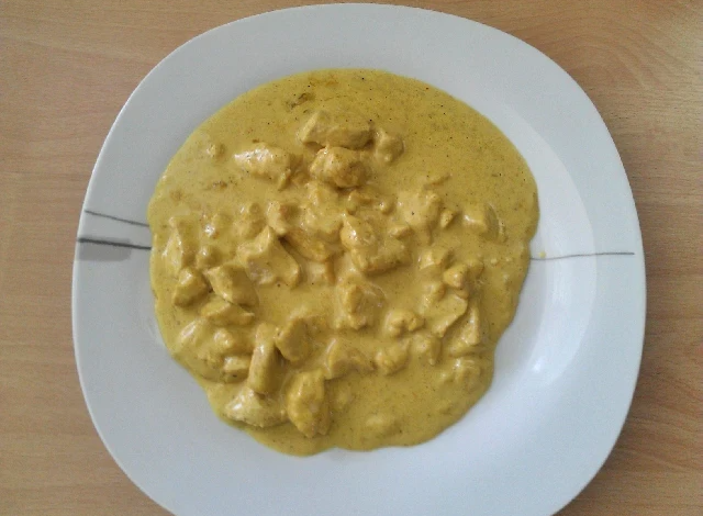 - Anschließend das Schlaobers und das Currypulver hinzufügen und gut umrühren. Das Fleisch beigeben und alles ca. 10-15 Minuten lang köcheln lassen. Mit Salz und Pfeffer abschmecken und servieren.
