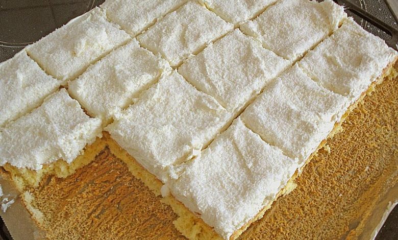 In der Zwischenzeit gekühltes Schlagobersgemisch mixen bis cremig und anschließend auf gekühltes Biskuit streichen, Kokosraspel darüber, in Schnitten schneiden – fertig! Schmeckt besser als Rafaellokugeln!