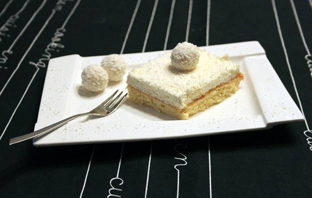 - In der Zwischenzeit das gekühltes Schlagobersgemisch mixen bis es cremig wird und anschließend auf das gekühlte Biskuit streichen. Noch mit den Kokosflocken bestreuen und Schnitten schneiden.