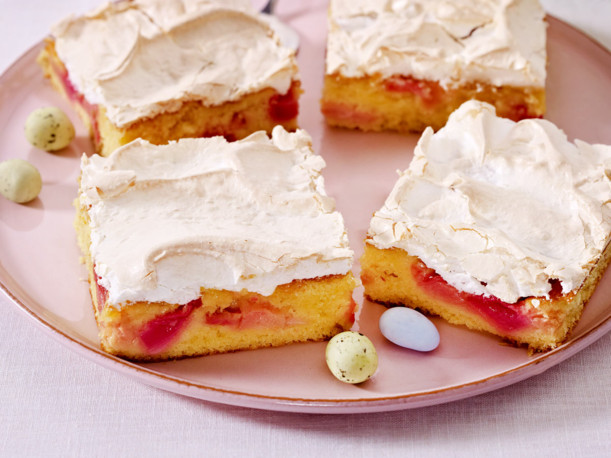 Mehl und Backpulver mischen und portionsweise kurz unterrühren. Auf die Fettpfanne streichen. Rhabarber darauf verteilen. Im vorgeheizten Ofen (E-Herd: 175 °C/Umluft: 150 °C/Gas: s. Hersteller) ca. 30 Minuten backen.