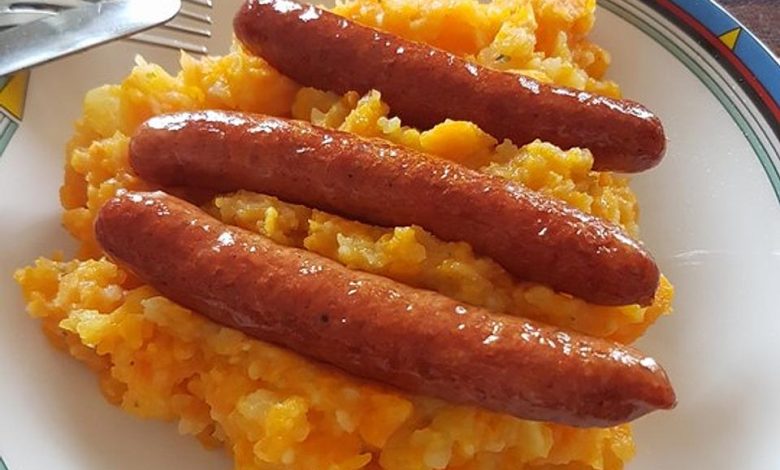 Der Eintopf soll recht süß schmecken. Dazu passen sehr gut Kasseler oder geräucherte Mettenden. Der Kontrast zwischen süß und salzig kommt meist sehr gut an. Wer den Eintopf kräftiger mag und ihn nicht vegetarisch braucht, kann die Mettenden direkt im gleichen Topf oben drauf legen und so garen. Vor dem Stampfen natürlich raus nehmen.