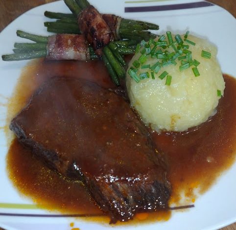 Fleisch samt Marinade dazu, noch mit Rotwein und in heißem Wasser aufgelösten Suppenwürfel aufgegossen. 2 Zweige Rosmarin aufs Fleisch und 3 Stunden zugedeckt im Backrohr bei ca 180-200 grad ober und Unterhitze schmoren lassen. Nach dieser Zeit hab ich das Fleisch aufgeschnitten den Saft püriert, Salz Pfeffer, Kümmel und Essig dazu und das Fleisch wieder samt Soße zurück in die Schmorpfanne und noch 1 Stunde mit Deckel weiterschmoren lassen.