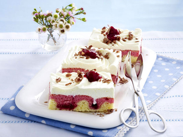 Kuchen mit einem in heißes Wasser getauchten Messer in Stücke schneiden. 150 g Rote Grütze in Klecksen auf den Stücken verteilen. Mit Schokoraspel bestreuen.