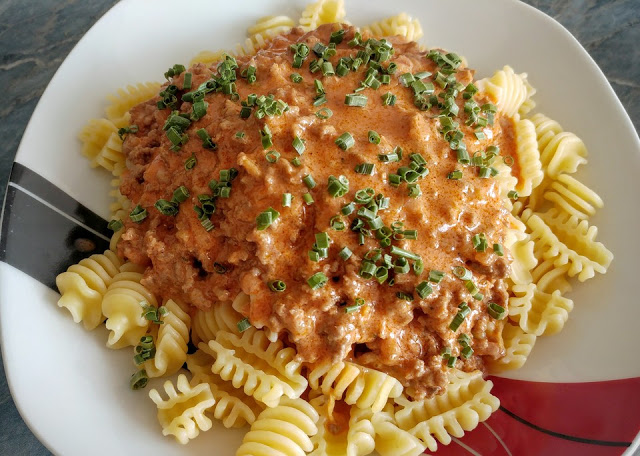 Etwa 15 Minuten bei schwacher Hitze dünsten, häufig umrühren. Die saure Sahne kurz vor dem Servieren darüber gießen. Heiß servieren mit gekochten Nudeln oder Reis.