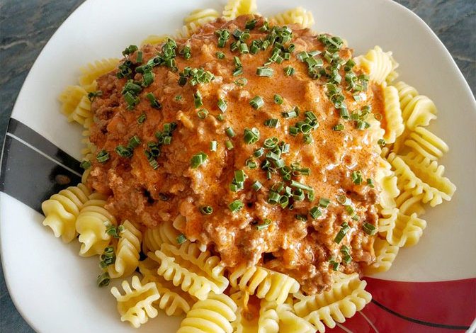 Etwa 15 Minuten bei schwacher Hitze dünsten, häufig umrühren. Die saure Sahne kurz vor dem Servieren darüber gießen. Heiß servieren mit gekochten Nudeln oder Reis.