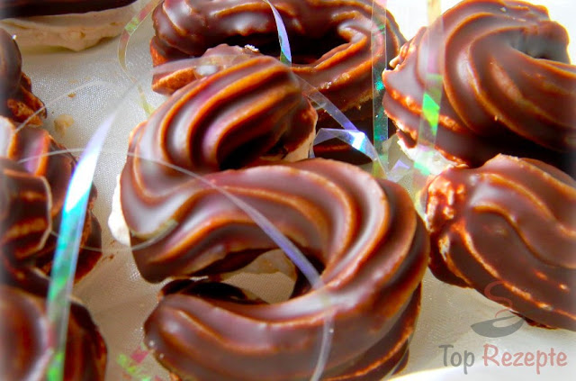 Zartbitterschokolade und Kokosfett im Wasserbad schmelzen. Die Teile in die Schokoladenglasur eintauchen. An einem kalten Ort fest werden lassen.