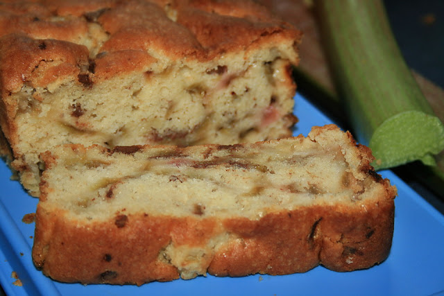 Butter/Margarine, Eier, Salz, Zucker und Vanillezucker in eine Schüssel geben und ca. 3 Minuten schaumig schlagen. Dann Mehl und Backpulver darunter mischen und nochmals rühren. Zuletzt den Rhabarber und die Schokoladenwürfel dazu geben und gut unterheben.
