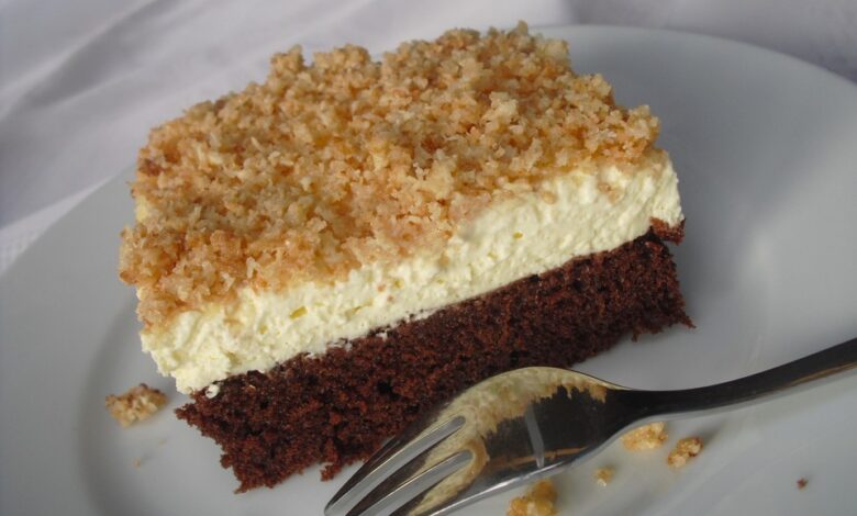 Die Zutaten für den Teig verrühren und auf einem Kuchenblech (mit hohem Rand) bei 175°C Ober-/Unterhitze ca. 25 Minuten backen.