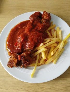 Schweinefleisch, Schinkenspeck, Zwiebeln und Paprikaschoten in nicht zu kleine Würfel schneiden. Alles abwechselnd auf Spieße stecken, gut andrücken. Am Ende des Spießes am besten Fleisch oder Schinkenspeck verwenden, dann hält es besser.In einer Pfanne die Spieße in Öl kräftig anbraten und herausnehmen. Die übrig gebliebenen Zwiebeln, Schinkenspeck und Paprika in kleinere Würfel schneiden und in der gleichen Pfanne kurz anbraten und 10 Minuten dünsten. Mit der Fleischbrühe ablöschen und in einen größeren Topf umfüllen. Die passierten Tomaten hinzufügen und mit Currypulver kräftig würzen. Mit dem Honig und den restlichen Gewürzen nach Geschmack abschmecken.
