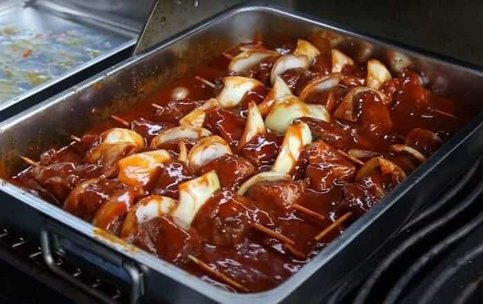 In die fast fertige Schaschliksoße legen wir nun unsere Schaschlikspieße, zum durchgaren. Die Spieße ab und zu wenden.