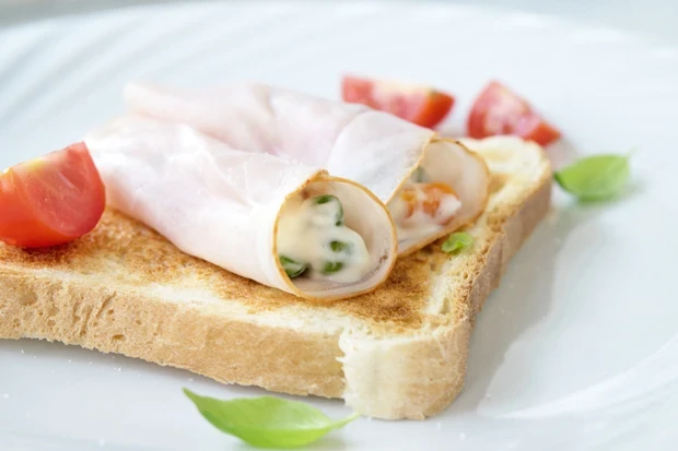 3. Nun die Masse in die Mitte eines jeden Schinkenblattes geben und zu einer Rolle formen.