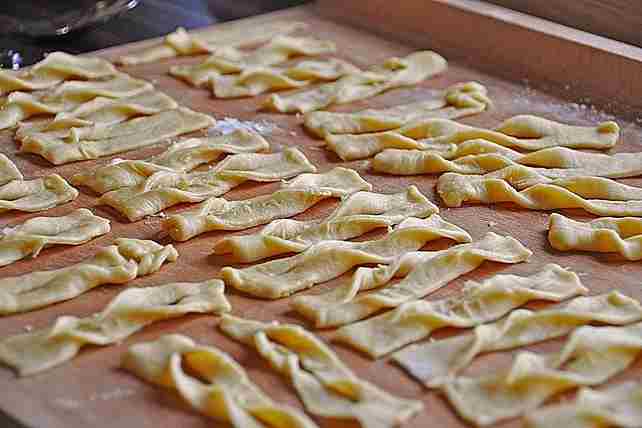 3 Jetzt dünn ausrollen und mit einem Messer oder Rädchen 3 cm breite und 10-15 cm lange Streifen schneiden. Jeden Streifen in der Mitte der Länge nach 4 bis 5 cm einschneiden und das eine Ende durch das Loch durchziehen.