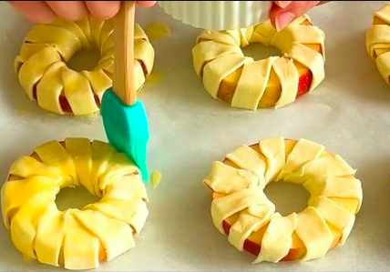 Nun die Apfelscheiben mit dem verquirlten Ei einpinseln.