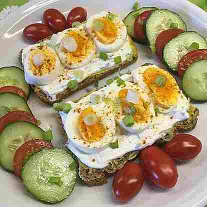 Die Brotscheibe mit Senf bestreichen (statt Butter) – den Kräuterquark darauf verteilen. Auf den Quark die Eischeiben legen und würzen. Über dem Brot und am Tellerrand nun die Gurken- und Tomatenscheiben nett anrichten und würzen. Alles mit den Lauchzwiebelröllchen bestreuen.