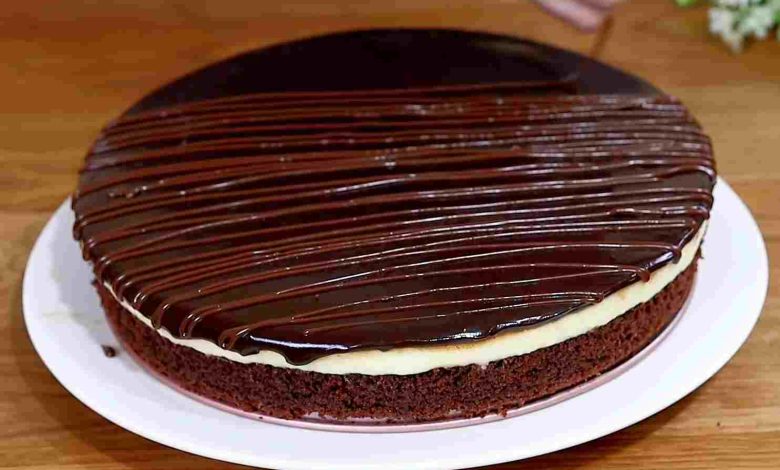 4. Nun die Sahne bei milder Hitze erwärmen, aber nicht kochen. Wenn sie warm ist, sofort vom Herd nehmen, die in Stücke gebrochene Schokolade hineingeben und unter Rühren schmelzen. Als letztes die Glasur anschließend auf dem abgekühlten Pudding verteilen. Den Kuchen Kalt stellen und danach servieren.