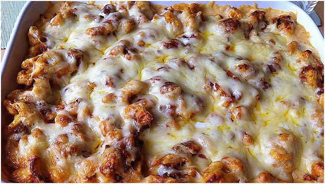 Fleisch und Spätzle mischen, in gebutterte Auflaufform füllen, die Sahne darüber gießen, die Käsescheiben in Streifen schneiden und in Gitterform darüber legen.