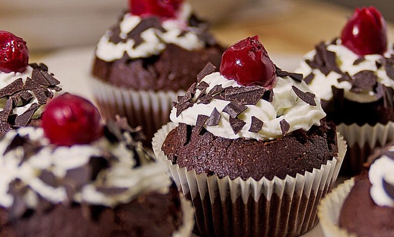 Die kalte Sahne mit Sahnesteif und Vanillezucker steif schlagen, auf die Schokoküchlein spritzen und jedes mit einer Kirsche und Schokoraspeln verzieren.