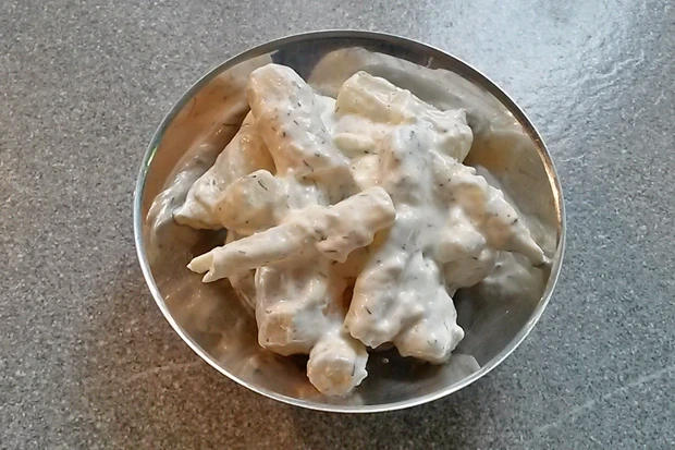 - Dann abseihen und auskühlen lassen. Mayonnaise, Zitronensaft, 2 EL Essig, Joghurt, Sauerrahm, Senf, Zucker, Pfeffer zu einer Marinade verrühren.