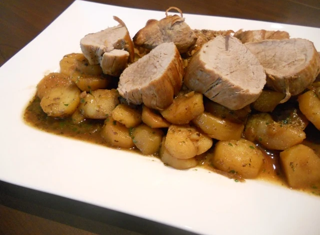- Die Erdäpfelscheiben zufügen nochmals kurz durchrühren, vom Herd nehmen und 2 bis 3 Minuten kurz durchziehen lassen. Den Braten aus der Folie heben, den entstandenen Bratensaft zu den Majoranerdäpfeln geben.