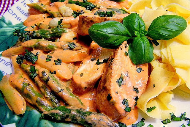 Spargel in rosa Basilikum – Käse – Sauce mit Filet vom Huhn oder Pute