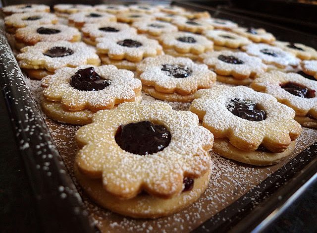 Gelee glatt rühren, auf die heißen, nicht durchlöcherten Plätzchen streichen. Je 1 durchlöchertes Plätzchen aufsetzen, etwas andrücken, abkühlen lassen, mit Puderzucker bestäuben.
