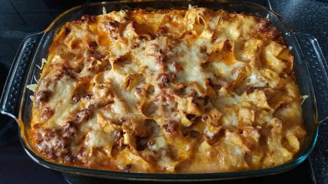 Gleichzeitig die in Würfel gehackte Zwiebel in Öl anbraten, dann das Hackfleisch dazugeben und ebenfalls anbraten. Mit dem Rotwein ablöschen und mit Tomatenmark, Thymian, Cayennepfeffer und Salz abschmecken. Dann die Nudeln unterheben. Das Ganze in eine gefettete Auflaufform geben. Käse und Sahne darüber verteilen. Im vorgeheizten Backofen bei 200 °C Umluft ca. 25 – 30 Minuten überbacken. Heiß servieren.