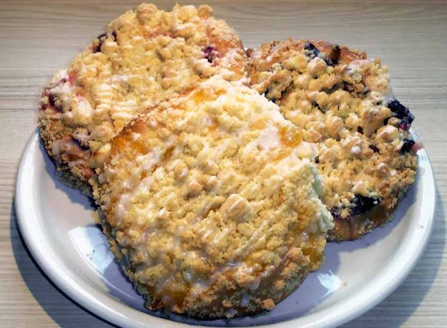 Ein Backblech mit Backpapier auslegen. Den Hefeteig nochmal kurz durchkneten und in 6 gleich große Stücke teilen. Die Teigstücke zu runden Streuseltalern mit ca. 12 cm Durchmesser formen, auf das Backblech legen, und mit den Früchten belegen. Bei Bedarf die Früchte kurz zuvor etwas zuckern. Dann die Streusel auf den Streuseltalern verteilen. Die Streuseltaler nochmals ca. 15-30 Minuten gehen lassen und dann im vorgeheizten Backofen bei 180 Grad Umluft oder 200 Grad Unter/Oberhitze ca. 20 Minuten goldgelb backen.
