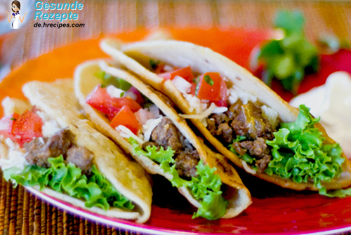 Die Taco Shells können dann nach belieben mit Hackfleisch, Käse, Avocado, saurer Sahne, Salat, Tomaten, Koriander und Tacosauce gefüllt werden.