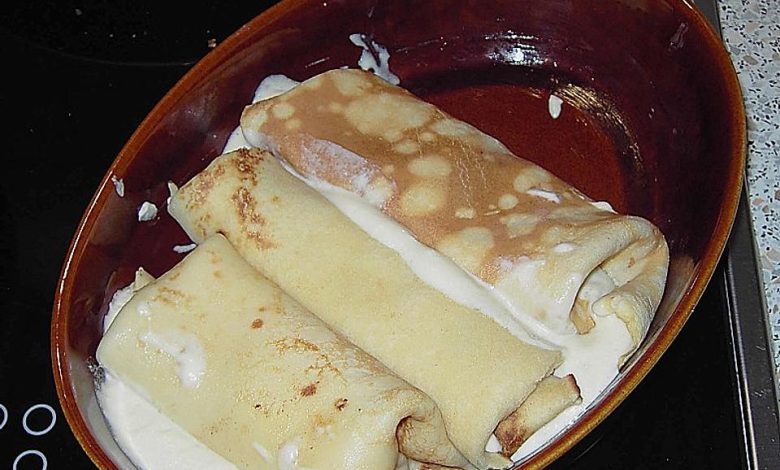 Creme fraîche mit Puderzucker und dem restlichen Ei verrühren und über die Palatschinken geben. Im vorgeheizten Backofen auf mittlerer Schiene bei ca. 200 Grad 15 bis 20 Minuten überbacken.