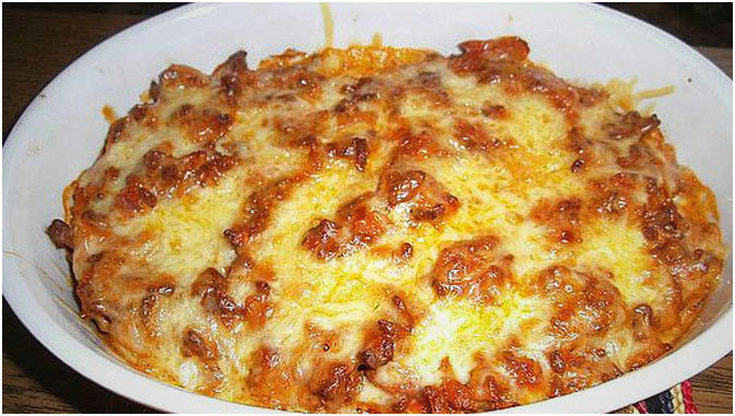 Auflaufform ausfetten, das Hackfleisch-Sauerkraut-Gemisch einfüllen, oben den zweiten Becher Schmand und den geriebenen Käse drauf.