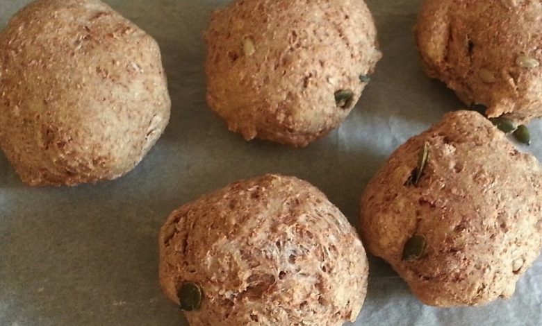 - Nehmen Sie den Teig erneut, fügen Sie die Kürbiskerne hinzu und vermischen Sie sie. Anschließend 20 runde Sandwiches formen und auf ein mit Backpapier belegtes Backblech legen. Lassen Sie sie 1 Stunde lang gehen.