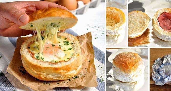 Warme brötchen mit ei, käse und schinken gefüllt