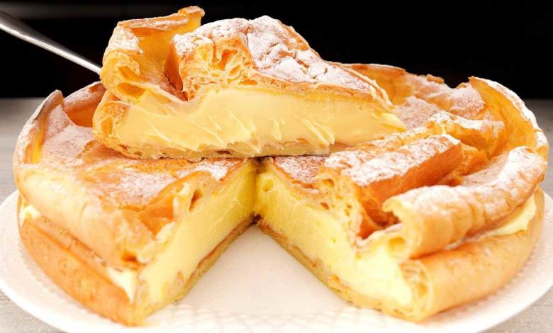 6. Als nachstes den Teigboden in zwei gleich große Hälften schneiden. Eine Hälfte mit der Creme bestreichen. Und die andere Hälfte drauflegen.