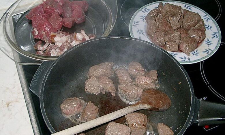 Das Rindfleisch in circa 3 cm große Würfel schneiden und in mehreren Portionen in einer heißen Pfanne mit Öl anbraten.